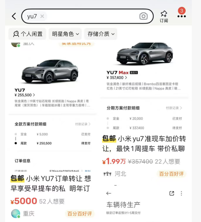 记者了解到,目前的转单市场中,小米SU7订单回收价已跌至1500元,YU7订单也仅有2000-3000元,这意味着早期支付5000元订金的车主转手就要亏损3000元左右。