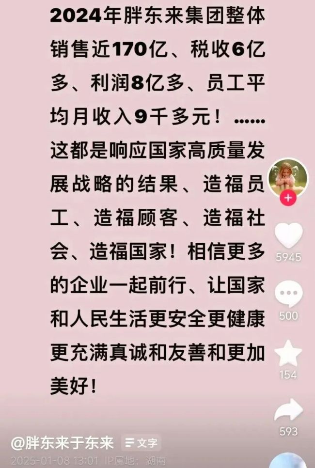而根据胖东来创始人于东来此前在社交平台发布的消息,2024年胖东来集团整体销售近170亿元、税收6亿多元、利润8亿多元、员工平均月收入9千多元。另据中国连锁经营协会发布的《2023中国连锁TOP100》榜单,首次上榜的胖东来2023年以13家门店107亿元的销售额排在第46位。