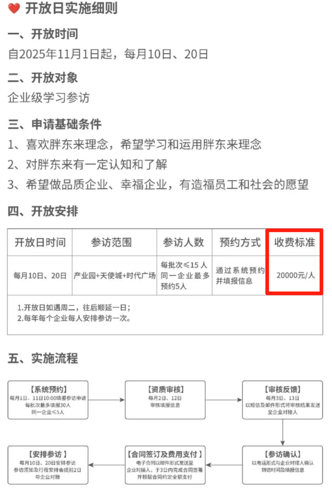 并且,参与人数每批次小于等于15人,同一企业最多预约五人,收费标准为一人2万元。每年每个企业每人安排参访一次。预约方式为通过系统预约并填报信息,胖东来方面将对报名企业进行资质审核。