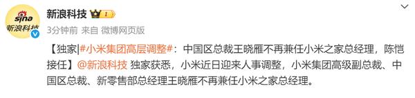 曝小米集团高层变动 王晓雁不再兼任小米之家总经理