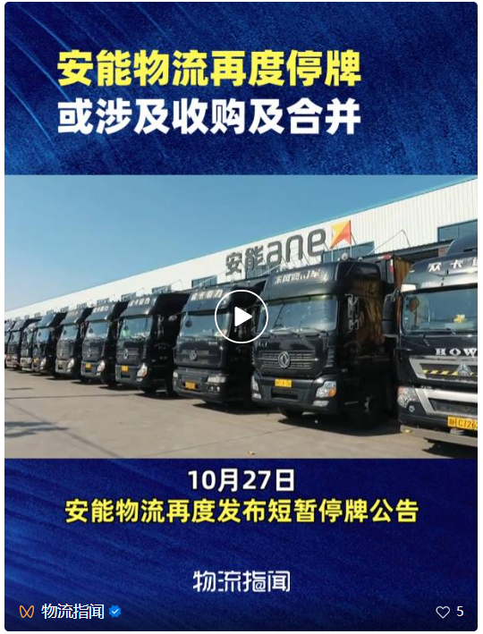 10月27日上午,安能物流再度发布短暂停牌公告,公司股份于2025年10月27日上午9时正起在香港联合交易所有限公司短暂停止买卖,以根据公司收购及合并守则发出载有公司内幕消息的公告。