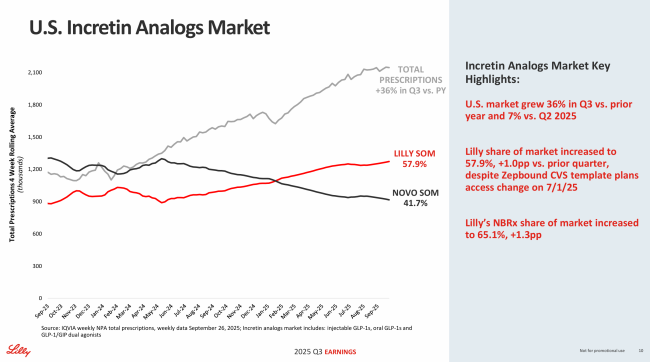 替尔泊肽(Mounjaro和Zepbound)和阿贝西利(Verzenio)是礼来制药业务营收增长的主力,在前三季度分别创收248.37亿美元(+125%)和41.18亿美元(+10%)。值得一提的是,礼来GLP-1产品和诺和诺德GLP-1产品的美国市场处方量占比差距在Q3进一步扩大(57.9% vs 41.7%)。