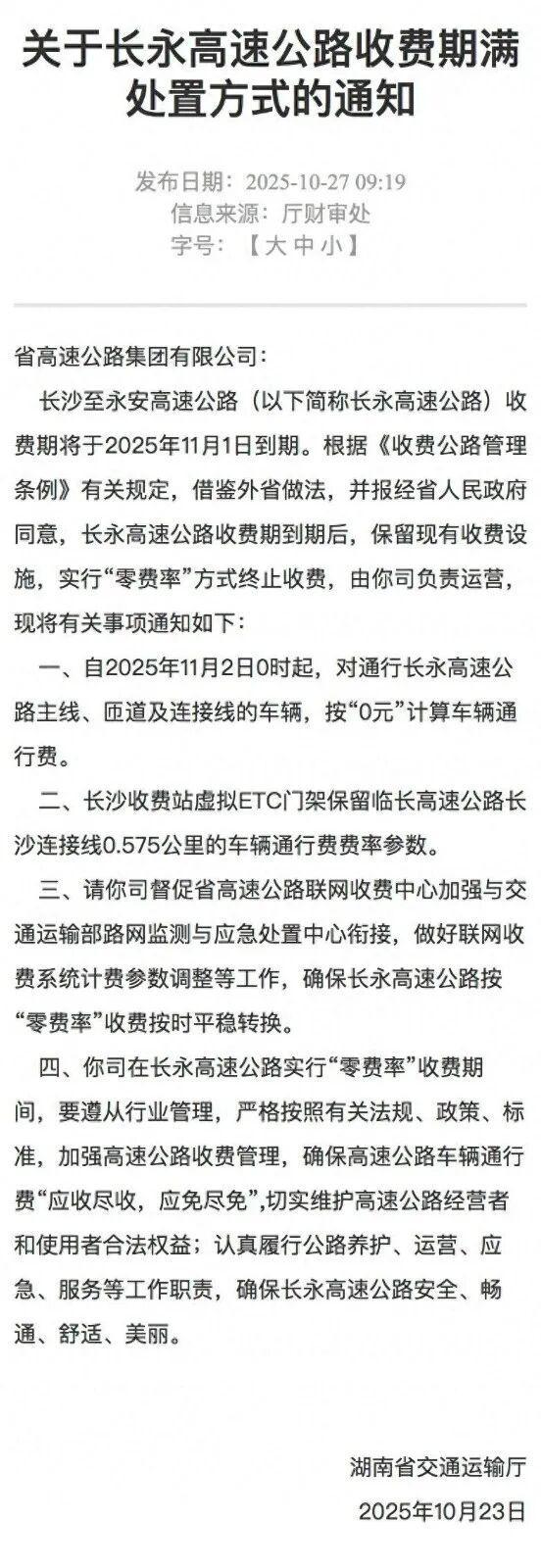服务近31年后,2025年11月2日0时起,长永高速公路实行“零费率”方式,终止收费,成为湖南首条长期免费的高速公路。“零费率”即对通行本路段的所有车辆按“0元”计算车辆通行费,并代为收取其他路段的车辆通行费。免费通行后,在长沙、三一、黄花、永安四个收费站均可实现“0元”通行,不仅节省车主费用,还将进一步降低区域内物流成本。