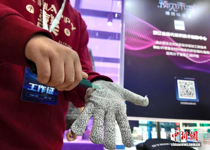 11月5日,浙江省现代纺织技术创新中心研发的超高分子量聚乙烯纤维手套,相比传统防护服饰具有更轻便、更防切割等特质。中新社记者 张斌 摄