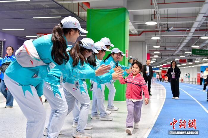 图为中场志愿者与前来观看十五运会开幕式的小朋友击掌。黄焯 摄