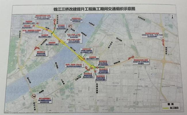 具体内容可查看《杭州市公安局交通管理支队关于钱江三桥改建提升工程施工期间采取相关交通管理措施的通告》。钱江三桥改建提升工程施工期间交通组织示意图展示了具体调整。