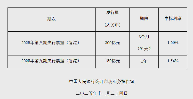 中新网11月24日电 据央行网站消息,人民银行于本周一(11月24日)通过香港金融管理局债务工具中央结算系统(CMU)债券投标平台,以利率招标方式发行了2025年第八期和第九期央行票据。具体情况如下:图片来源:央行网站截图