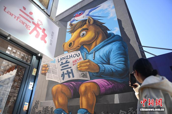 11月28日,在位于甘肃省兰州市城关区街头,游人在大型卡通“铜奔马”3D墙绘前拍照。中新社记者 李亚龙 摄