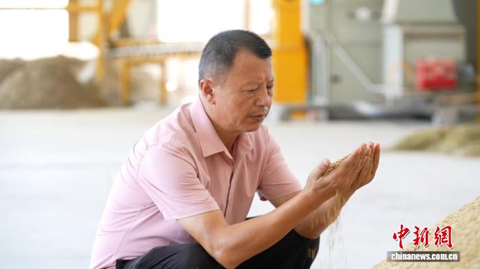 杨邓平手捧丰收的稻子进行观察。王博煜 摄
