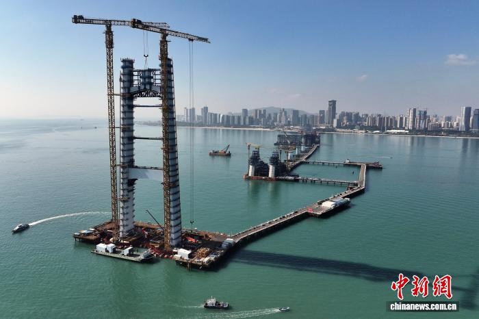 中新网厦门12月2日电 (吴冠标)随着最后一个钢壳吊装到位,厦金大桥关键控制性工程刘五店航道桥主塔1日正式完成封顶,标志着大桥建设取得了里程碑式进展,从“立塔成型”转入“悬索成桥”关键施工阶段。
