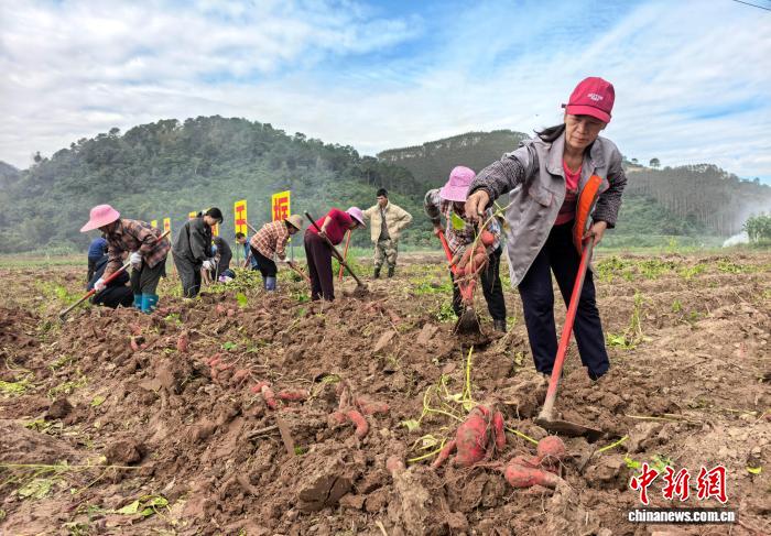 图为村民正在采收红薯。李金 摄