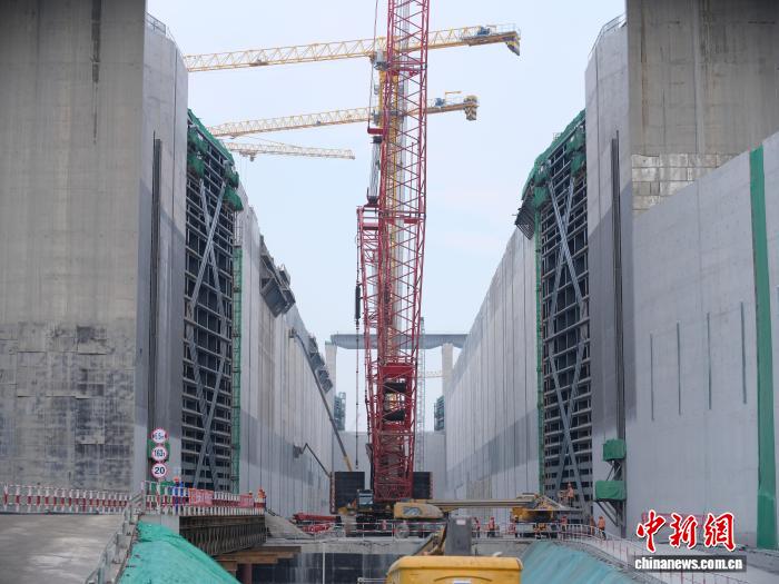 中新网南宁12月8日电 (记者 杨陈)记者8日从平陆运河集团获悉,近日,平陆运河马道枢纽上闸首左线最后一节人字门精准吊装落位,标志着平陆运河枢纽工程船闸人字门吊装工作全部完成,全面转入人字门附件及机电设备安装新阶段,为有序推进无水调试、有水调试奠定坚实基础。