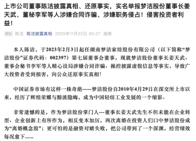 一边,是上市公司湖南梦洁家纺股份有限公司(下称“梦洁股份”)董事陈洁,通过个人社交平台,以“请君入瓮”“趁火打劫”“欺上瞒下”“赶尽杀绝”“偷天换日”等凌厉字眼,实名举报公司董事长姜天武及董秘李军涉嫌合同诈骗、职务侵占等多项严重问题。