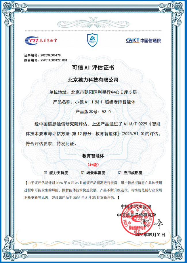 小猿AI超拟人老师智能体认证证书