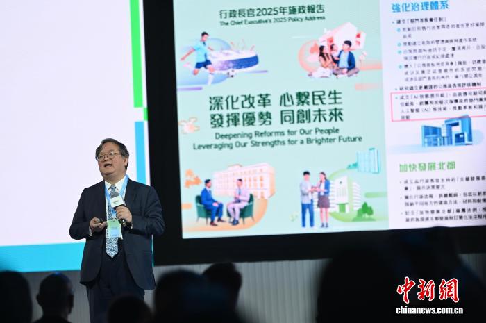 图为中国工程院外籍院士、香港科技大学首席副校长郭毅可以“从科研到应⽤:⾹港AI发展路径与‘港话通’的桥梁作⽤”作主题演讲。中新网记者 李志华 摄