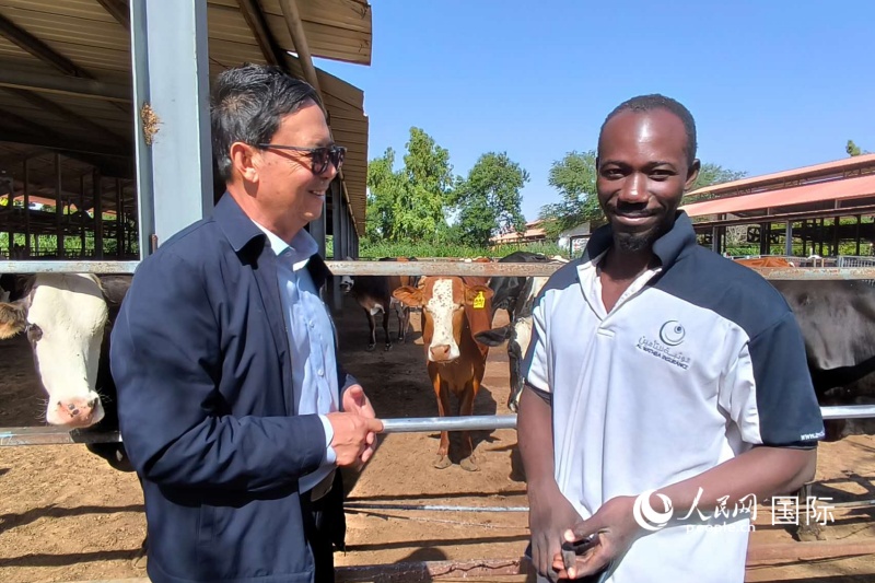 技术示范中心主任张洪恩正在向当地雇员讲解养牛注意事项。人民网记者 黄培昭摄
