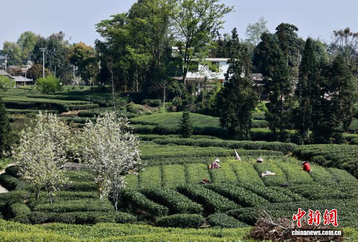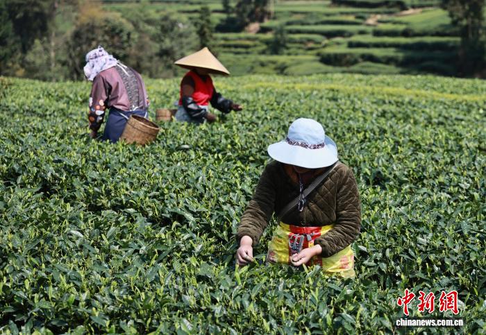 3月20日,正值中国二十四节气的春分,四川省雅安市名山区红星镇骑龙村,茶农在茶园里采摘春茶。中新社记者 王磊 摄