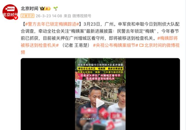 3月23日,申军良和申聪到刑侦大队配合调查,全社会对“梅姨案”的最新进展十分关注。民警去年锁定了“梅姨”,并在今年春节前将其抓获,目前她被关押在广州增城区看守所,即将被移送到检察机关。
