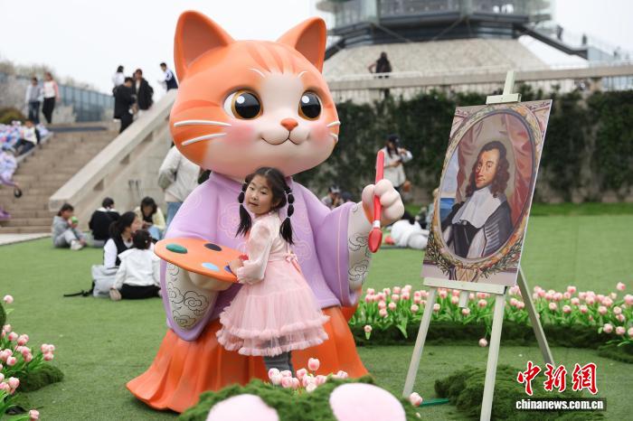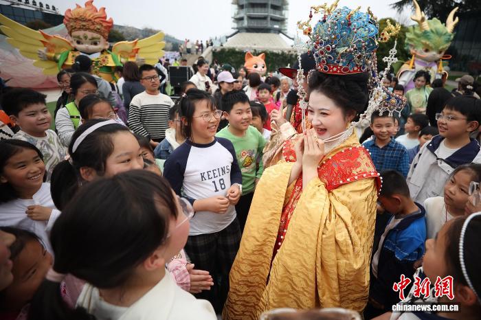 4月2日,江苏南京,孩子们在大报恩寺遗址博物馆春日文化盛会中与巡游的演员合影。中新社记者 泱波 摄