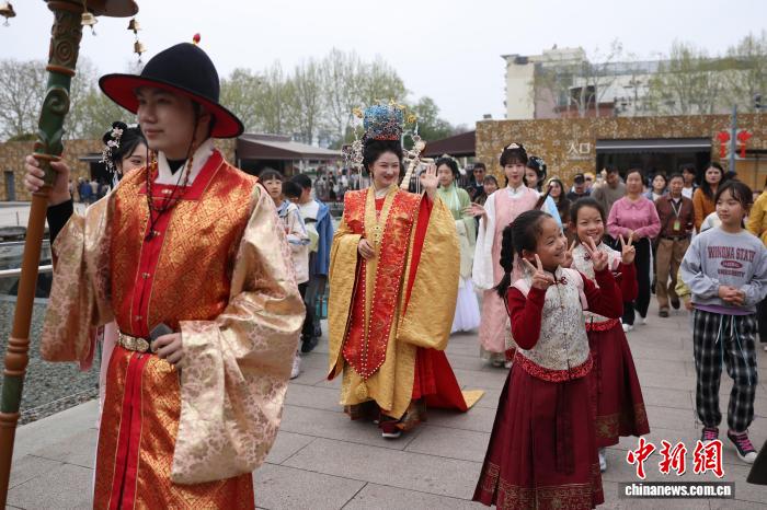4月2日,江苏南京,孩子们在大报恩寺遗址博物馆春日文化盛会中与巡游的演员合影。中新社记者 泱波 摄