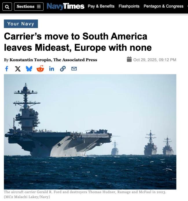 美国《海军时报》报道,以色列与哈马斯互相指责对方违反停火协议之际,美国政府将“福特”号航母从地中海撤出,部署到拉美周边水域执行打击贩毒任务。这一调动让美国面临罕见局面,即仅有一艘航母处于部署状态,且在欧洲和中东附近海域均无航母部署
