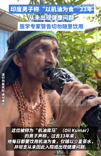 印度卡纳塔克邦一名男子因声称每天饮用机油长达33年而引发广泛关注。这名被称为“机油库马”的男子表示,他每天只喝机油,并辅以少量茶水,从未因此住院或出现健康问题