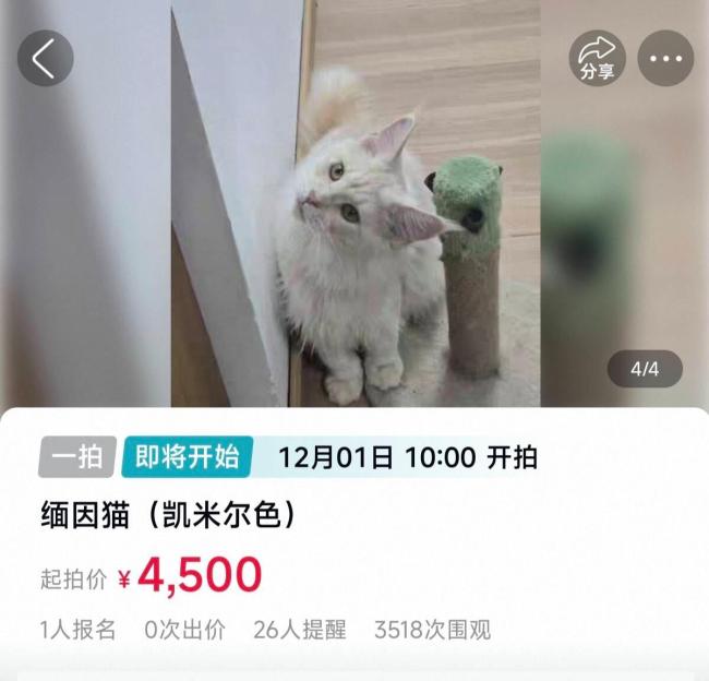 11月24日,在阿里资产平台上,一只凯米尔色缅因猫被挂出拍卖,起拍价为4500元。该拍卖吸引了3000多人次围观,目前已有一个人报名竞拍。根据竞拍公告,这只公猫已被北京市丰台区人民法院查封