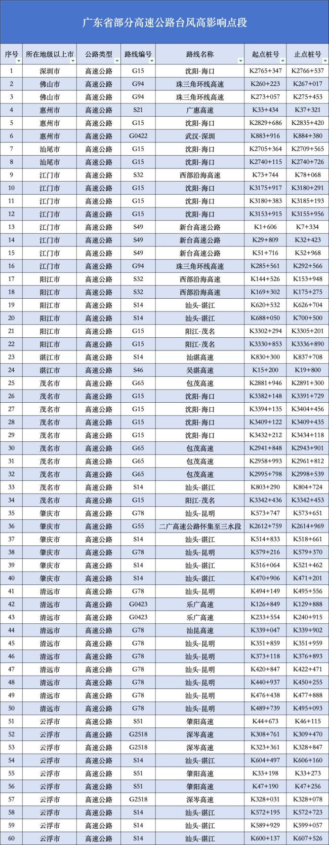 广东交警微信公众号今日13时发布消息,受台风影响,60个高速公路路段可能存在易积水、边坡滑塌等风险。气象台预计,今年第18号台风“桦加沙”将于24日在珠三角或粤西沿海一带登陆