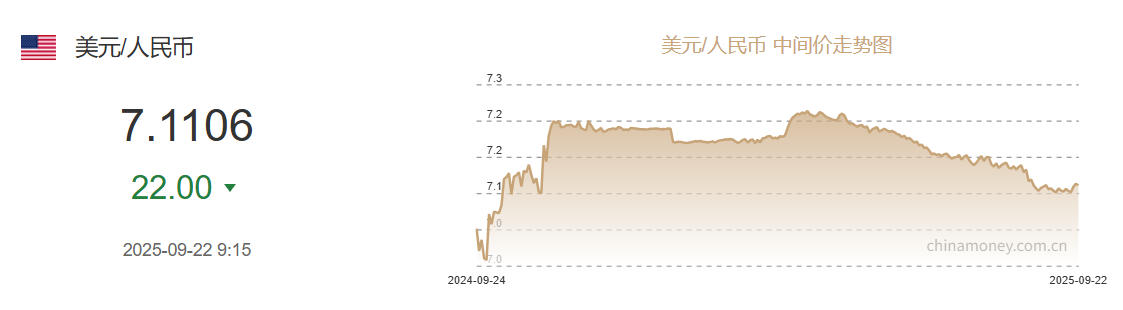 中新网9月22日电 据中国外汇交易中心网站消息,中国人民银行授权中国外汇交易中心公布,2025年9月22日银行间外汇市场人民币汇率中间价为:1美元对人民币7.1106元,上调22个基点。