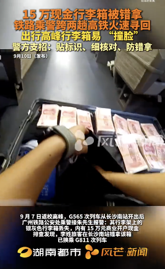长沙一旅客15万现金行李箱被错拿。长沙一旅客15万现金行李箱被错拿,铁路警方急速寻回。9月7日返校高峰,朱先生在G565次列车上报警称装有15万元现金的行李箱丢失。警方排查发现,李姓旅客在长沙南站误拿行李箱并换乘G811次列车。铁路警方迅速...