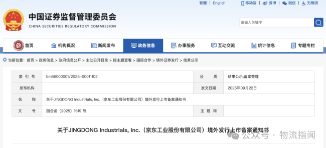 9月22日,中国证监会国际合作司发布关于JINGDONG Industrials, Inc.(京东工业股份有限公司)境外发行上市备案通知书。