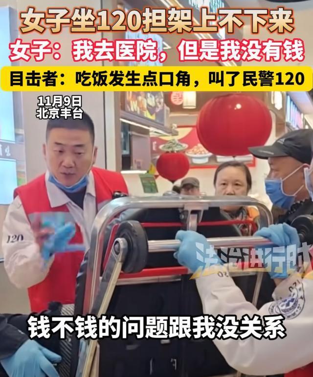 11月9日,在北京的一家餐馆里,一名女子因琐事与其他顾客发生争执。她坐在120担架上拒绝下来,无论工作人员如何劝说,她都坚持说:“我去医院,但是我没钱。”最终,120工作人员告知她的行为已经妨碍了秩序,女子这才从担架上下来
