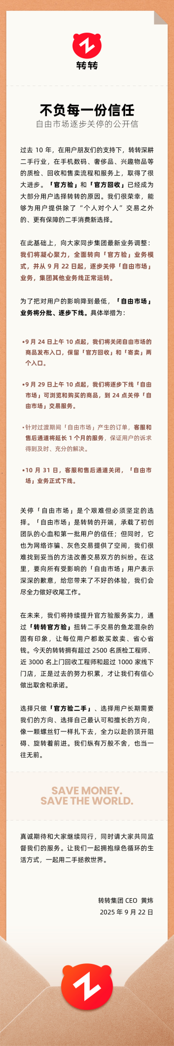 9月22日,转转集团发布官方公告,宣布将逐渐关停旗下“自由市场”业务。